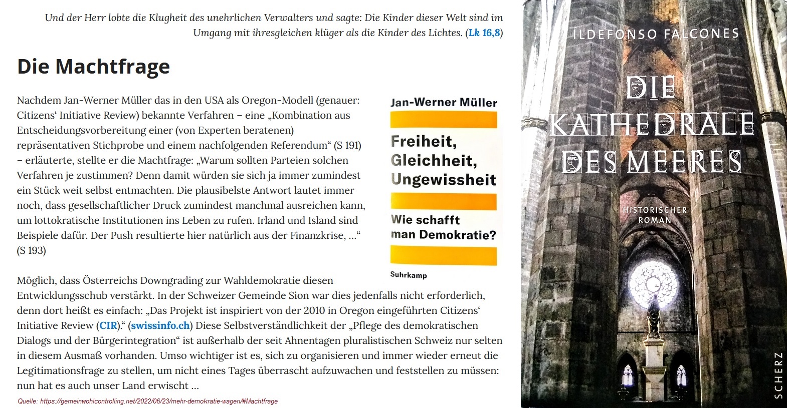 Eine der beiden Kammern eines Parlamentes kann im übertragenen Sinne wie eine Kirche für das Volk verstanden werden. Das entsprechende Bild dafür lieferte uns Ildefonso Falcones in seinem Historienroman „Die Kathedrale des Meeres„: