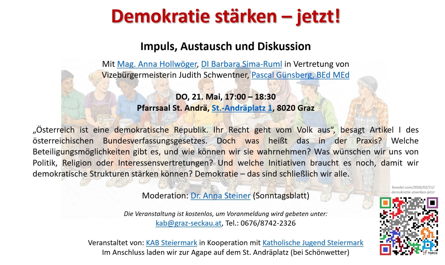 Reden wir darüber, was es braucht, um den Weg zu einer friedensfördernden partizipativ-repräsentativen Demokratie gemeinsam und ambitioniert zu gehen. Hier die Einladung von der KAB Steiermark zu Impuls, Austausch und Diskussion am Donnerstag, 21. Mai 2026 im Pfarrsaal St. Andrä in Graz. Thema: „Demokratie stärken – jetzt!„