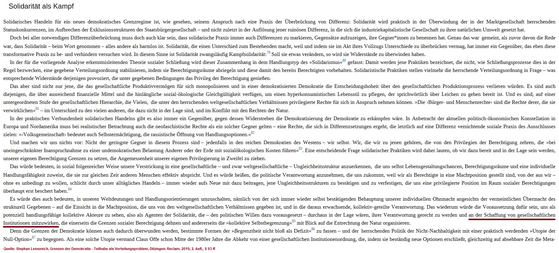Dazu gibt uns Stephan Lessenich ua folgende Hinweise: „Und machen wir uns nichts vor: Nicht der geringste Gegner in diesem Prozess sind – jedenfalls in den reichen Demokratien des Westens – wir selbst. […] Eine entscheidende Frage solidarischer Praktiken wird daher lauten, ob wir dazu bereit und in der Lage sein werden, unserer eigenen Berechtigung Grenzen zu setzen, die Angemessenheit unserer eigenen Privilegierung in Zweifel zu ziehen. […]