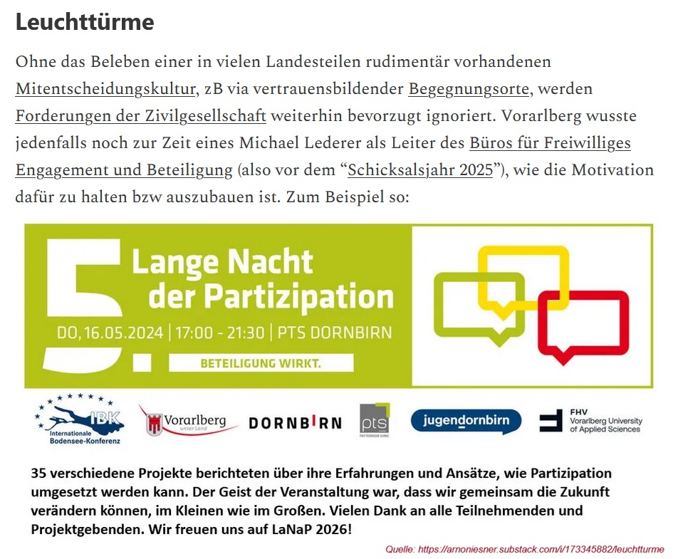 Wer Demokratien nachhaltig stärken will, investiert nicht in zeitlich befristete Kampagnen oder einzelne Veranstaltungen wie: partizipation.at/projekte, sondern in eine lebendige Partizipationskultur (zB: www.passegalwahl.at) mit dem Anspruch auf institutionalisierte Beteiligung in der Gesetzgebung.