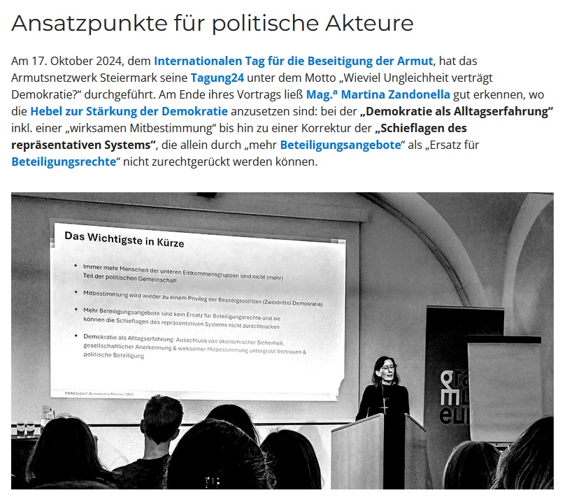 Abschließend kann noch einmal festgehalten werden, dass das Zusammenspiel unterschiedlicher Formen der politischen Beteiligung entscheidend für die Demokratiequalität ist. Es geht um eine gute Ausgewogenheit der repräsentativen Demokratie mit Formen der direkten und partizipativen Demokratie. Letzteres bedeutet nicht nur mehr Arbeit, die sich effektiv lohnt, sondern auch eine neue Art der Politik voranzutreiben.“ (Michael Lederer, Die Armutskonferenz et al. [Hrsg.] [2020]: Stimmen gegen Armut. BoD-Verlag)